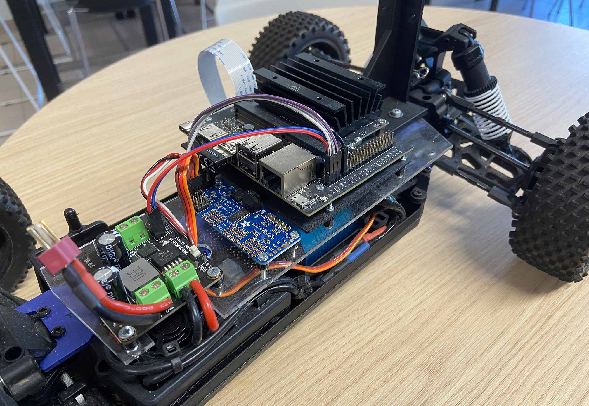 A fully autonomous car that can drive around a track and avoid obstacles. It uses a camera in combination with a trained AI model.